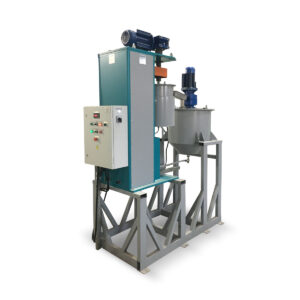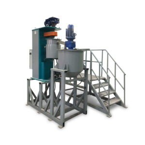 Предварительное приготовление суспензии происходит в якорной мешалке. Загрузка сухих и жидких компонентов осуществляется вручную. Приготовленная суспензия насосом перекачивается через помольную камеру аттритора с мелющими телами, приводимыми в движение ворошителем. Слив суспензии из аттритора в мешалку при циркуляции осуществляется по съемному патрубку. Переключение на циркуляцию, выгрузку и отбор производится с помощью трехходового крана. Выгрузка осуществляется из сливного патрубка мешалки самотеком.
